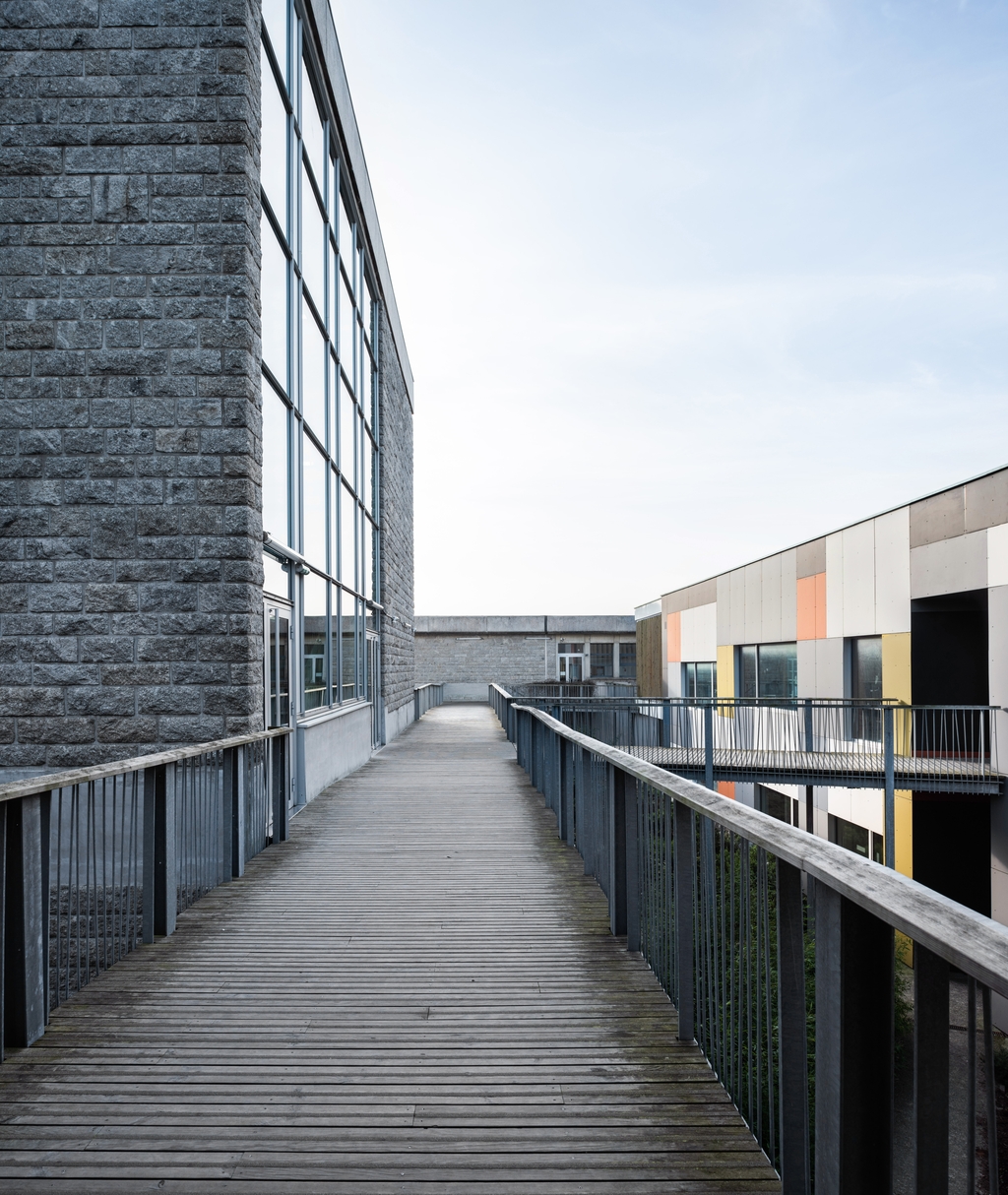 Passerelle entre le bâtiment 2 (externat) et le CDI (Thierry Soquet, architecte, 2012). A l'arrière plan, les ateliers.Immatriculation