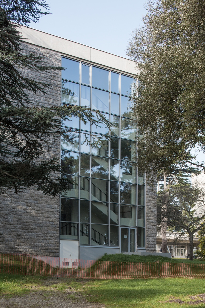 Le pignon est de l'externat et sa cage d'escalier largement vitrée (Patrice Simon, architecte, 1973).Immatriculation