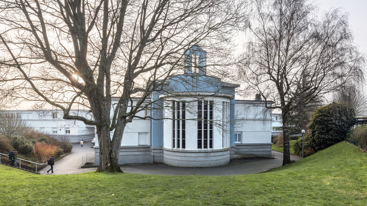 Le chevet et le clocher de la chapelle. Albert Hec architecte, 1939. A l'arrière-plan, à gauche, une des aile du bâtiment C (internat, ancien hospice de vieillards).Immatriculation
