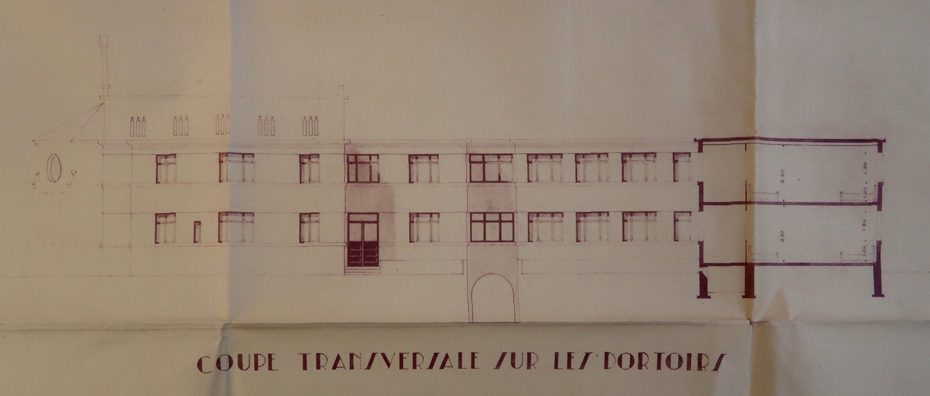 Coupe transversale sur les dortoirs. On distingue à gauche l'élévation du chevet de la chapelle, ainsi que la face ouest de la toiture de la nef. Albert Hec, architecte, 1936.Immatriculation