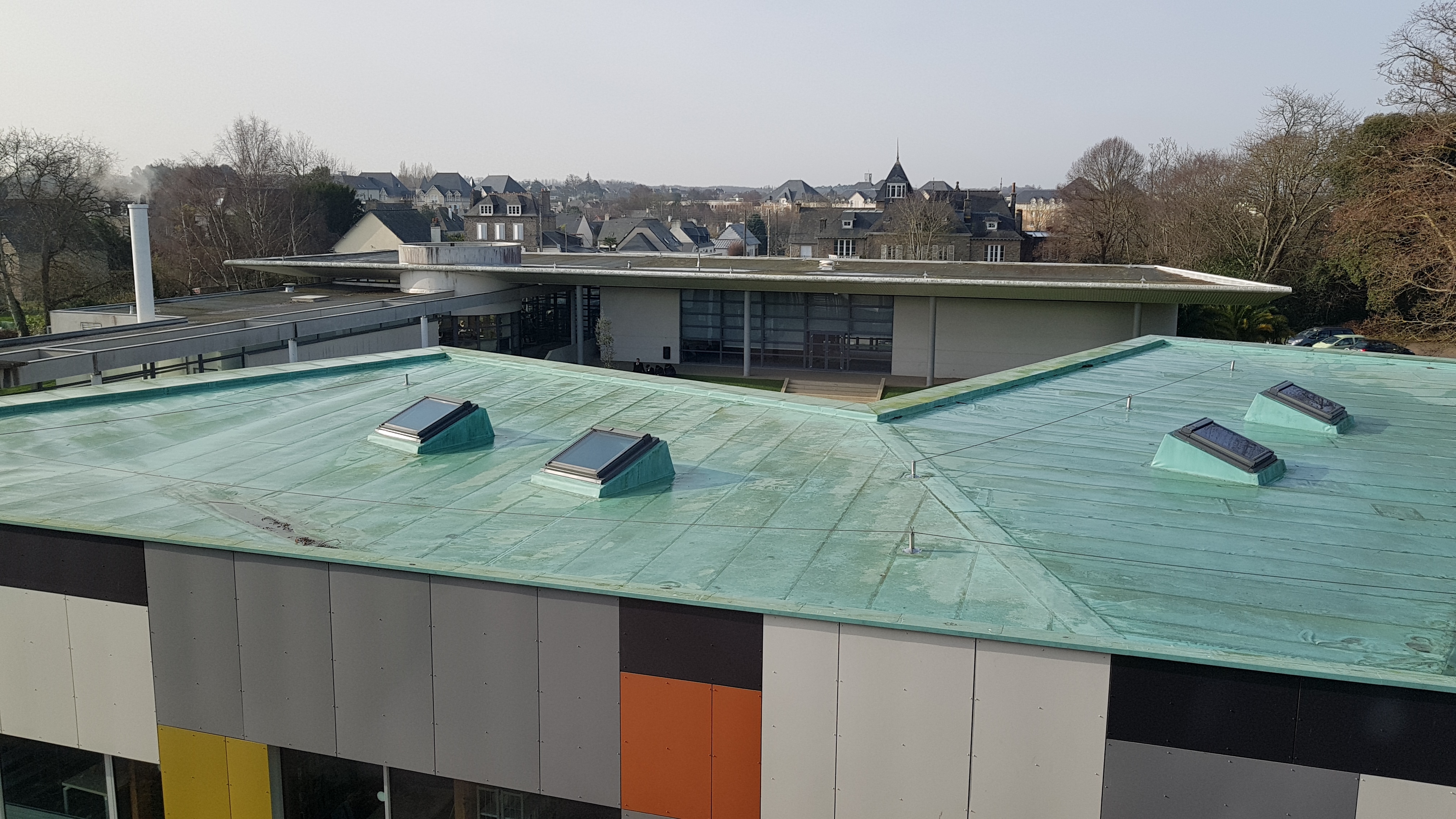 Vue d'ensemble depuis un étage de l'externat, selon un axe nord sud : toits du CDI, restaurant pédagogique, villa Surville.Immatriculation
