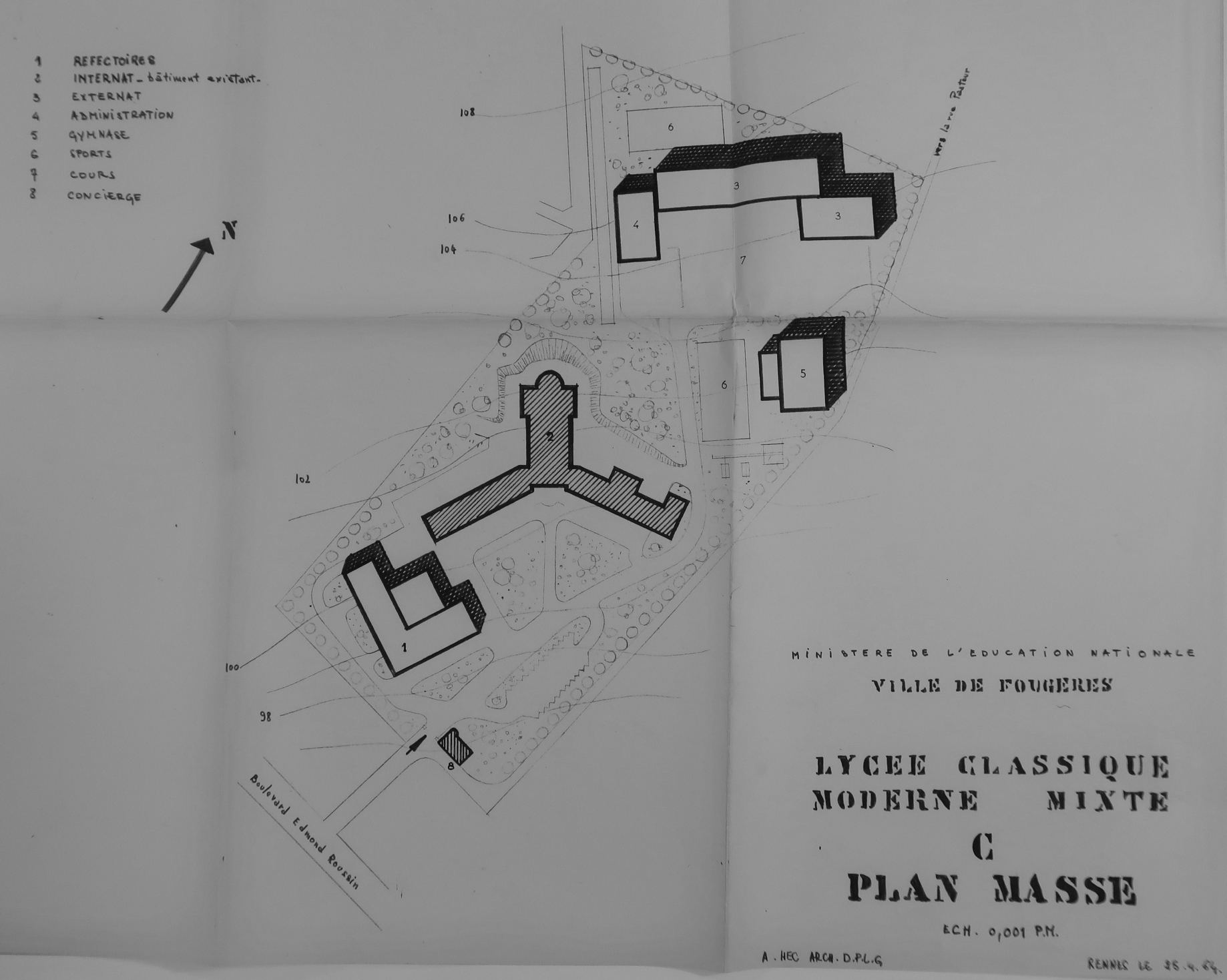 Plan masse du lycée classique et moderne mixte. Albert Hec, architecte, 1964.Immatriculation