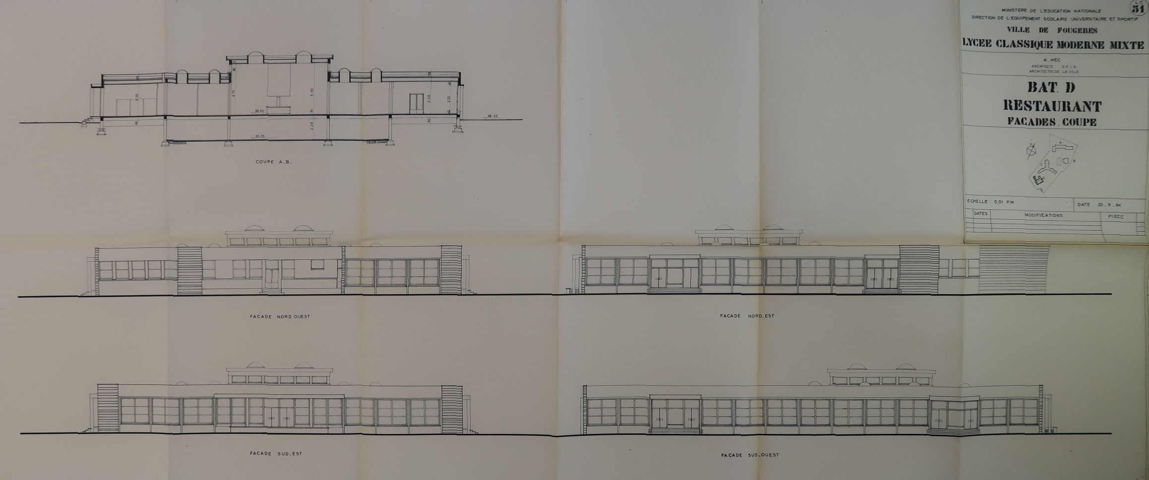 Bâtiment D Restaurant. Façades - Coupe. Albert Hec, architecte, 1964.Immatriculation