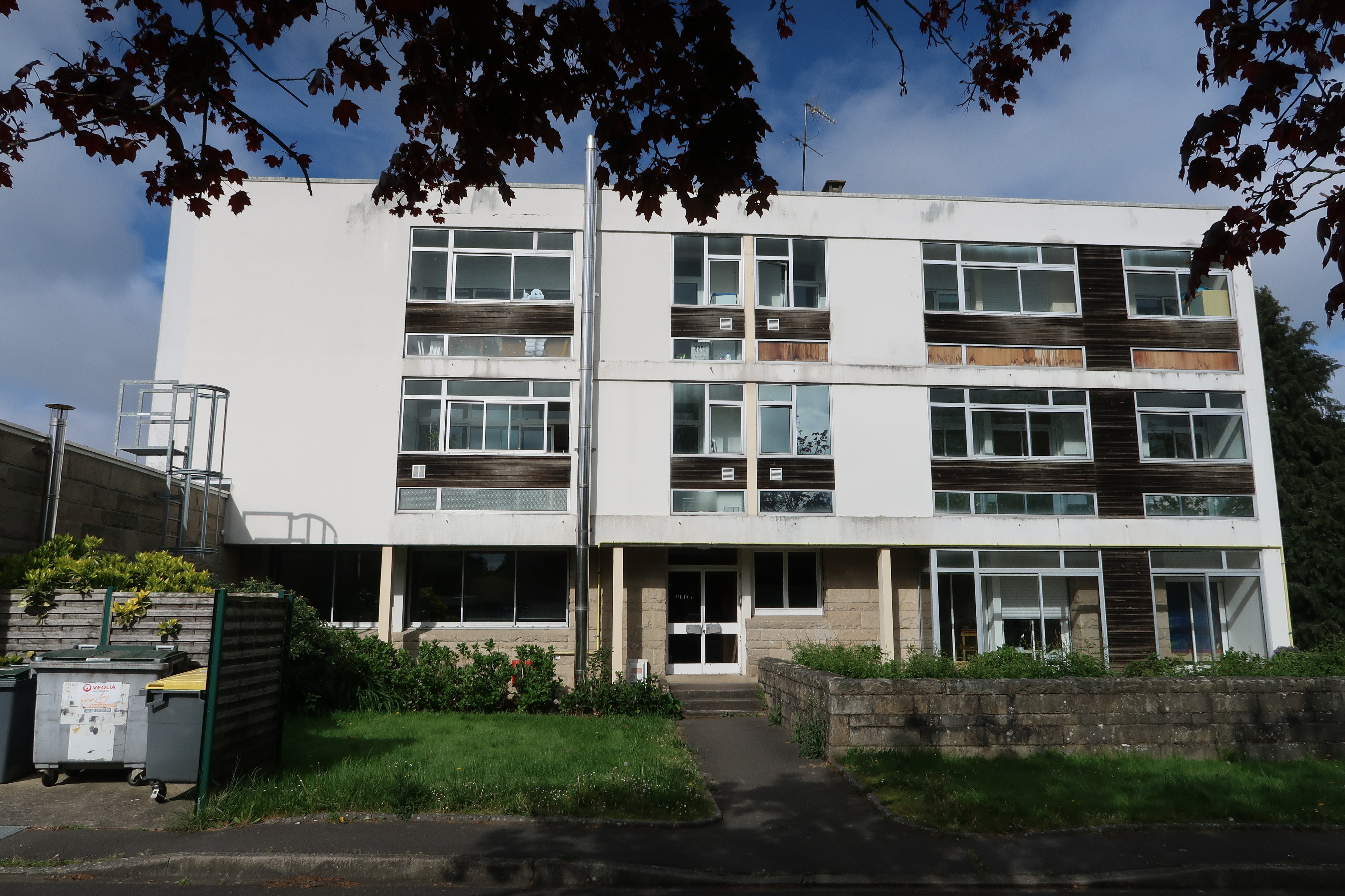 Bâtiment A, façade est des logements de fonction. Louis Arretche et Jean Monge, architectes, plans 1959.Immatriculation