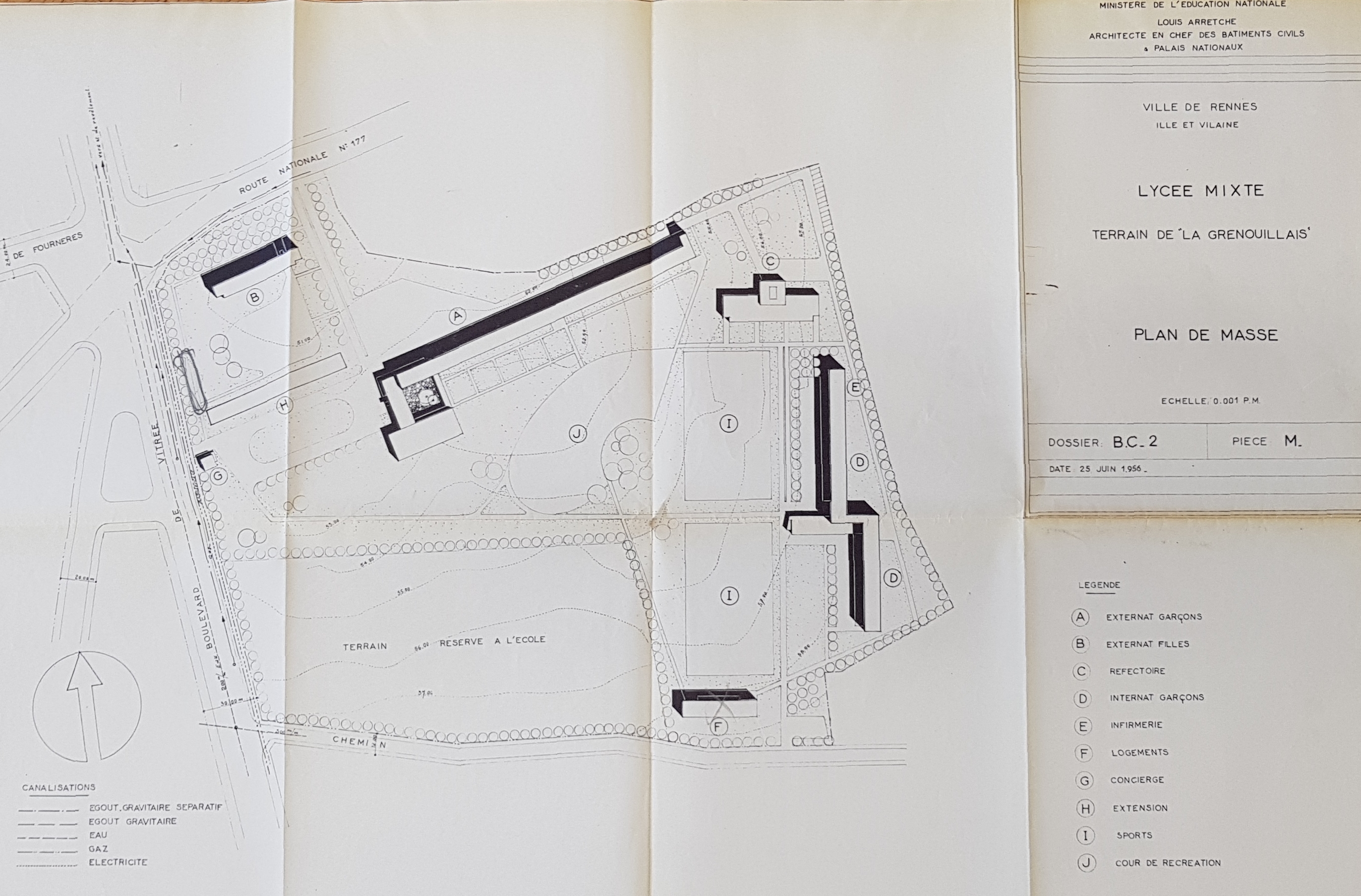 Lycée mixte terrains de La Grenouillais, plan de masse. Louis Arretche, architecte, 1956. Ce plan a été abandonné lorsqu'il a été décidé, en 1959, d'implanter sur ce site l’École nationale d'enseignement technique (aujourd'hui lycée Joliot Curie). Le lycée Chateaubriand est implanté in fine sur une parcelle légèrement plus au sud, séparée de l’École nationale par un collège.Immatriculation