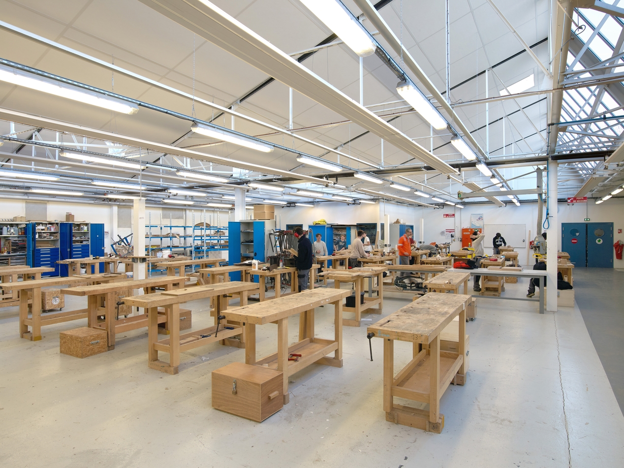Vue intérieure de l'atelier ébénisterie : des établis alignés et parfaitement rangés...Immatriculation