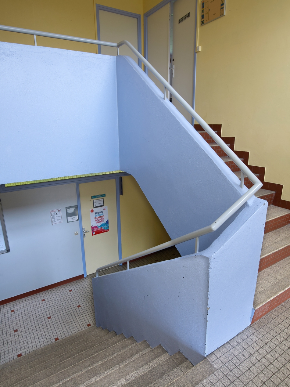 Escalier de l’administration, palier. Yves Guillou, architecte, 1962.Immatriculation