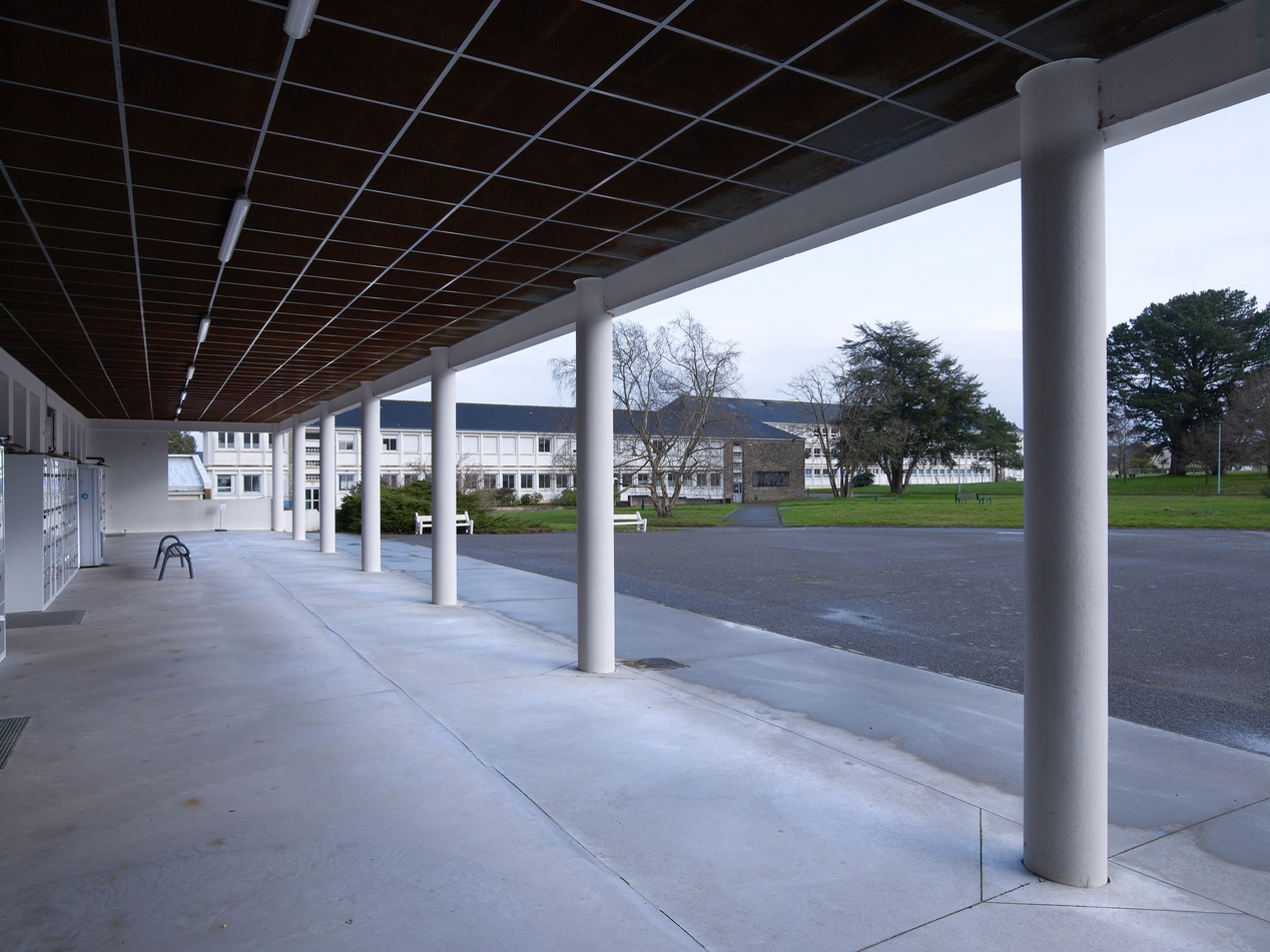 Vue prise sous le préau des ateliers. Yves Guillou, architecte, 1962.Immatriculation