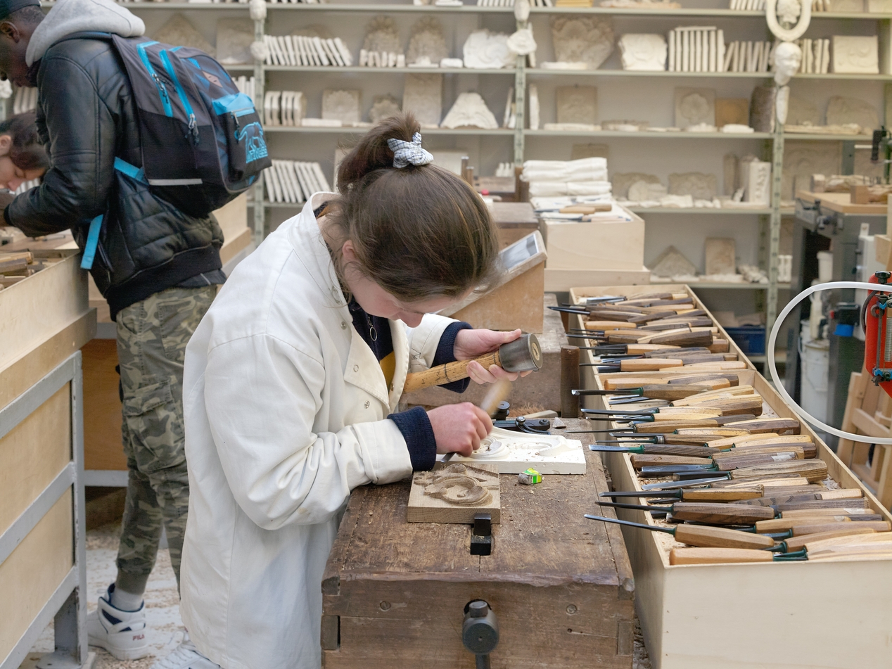 Atelier sculpture et collection de modèles en plâtre, à l'arrière plan. Noter la multitude de ciseaux à bois.Immatriculation