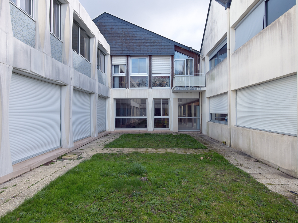 Façade sud-ouest des anciens préau et réfectoire (Yves Guillou, architecte, 1980). A gauche, façade de l'externat, à droite, pignon d'une extension de l'externat.Immatriculation