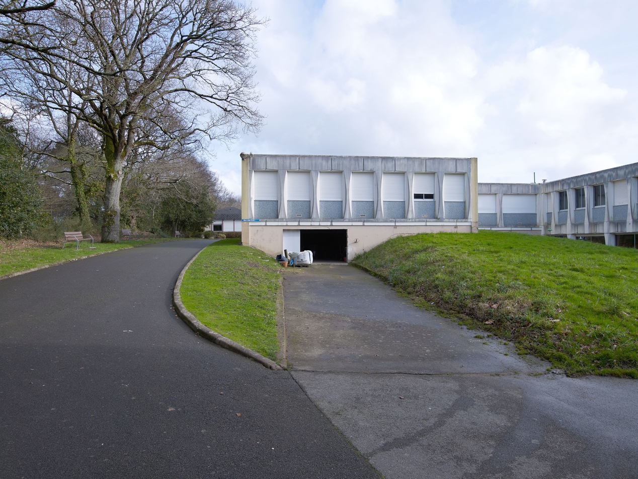 Façades nord-ouest de l'externat A (Yves Guillou, architecte, 1980). Noter les décrochements créant un patio semi-ouvert.Immatriculation