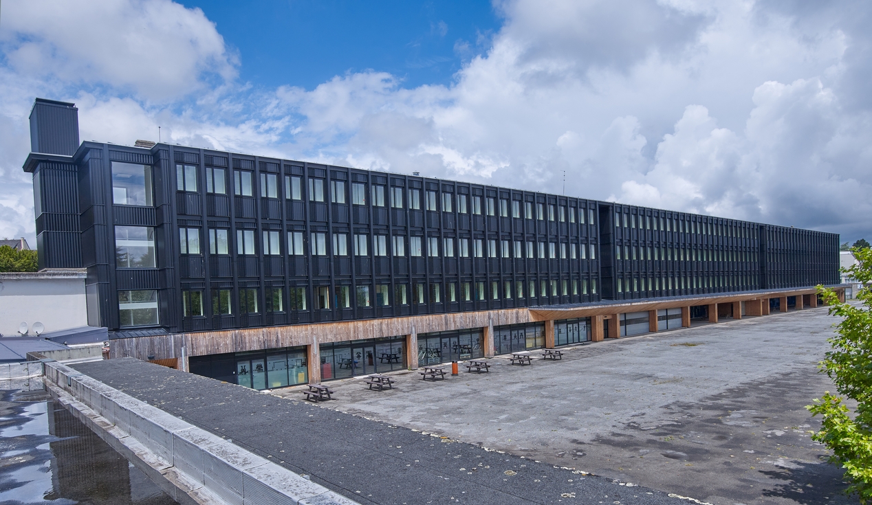 Bâtiment B, façade sud-est : une des deux barres d'externats, après réhabilitation thermique, par Anthracite architecture, en 2016. Avec ses 150 mètres, c'est l'une des deux plus longues de Bretagne. Vue prise du toit du restaurant scolaire.Immatriculation