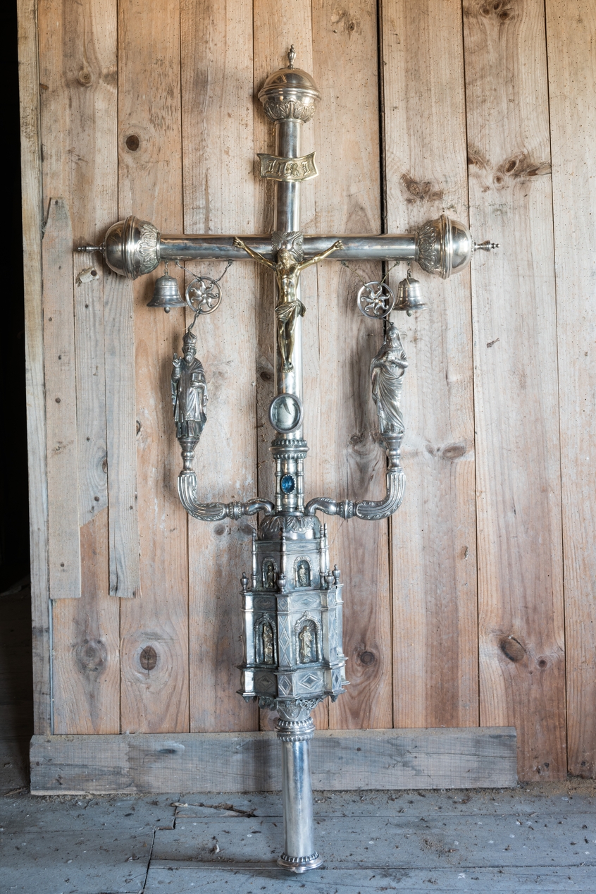 Vue de détail : partie supérieure d'une croix de procession.Immatriculation