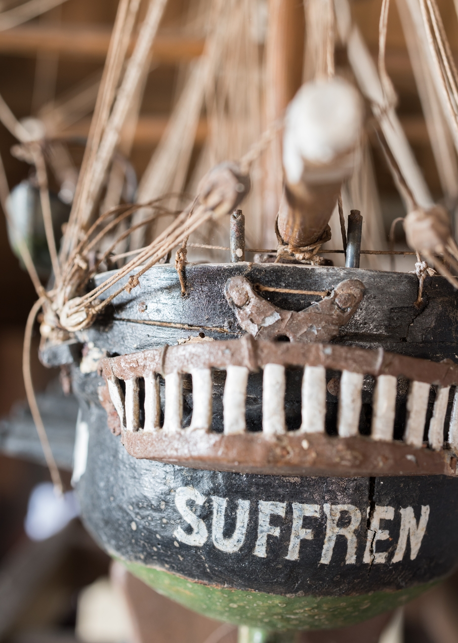 Vue de détail : maquette de bateau ex-voto, le "Suffren".Immatriculation