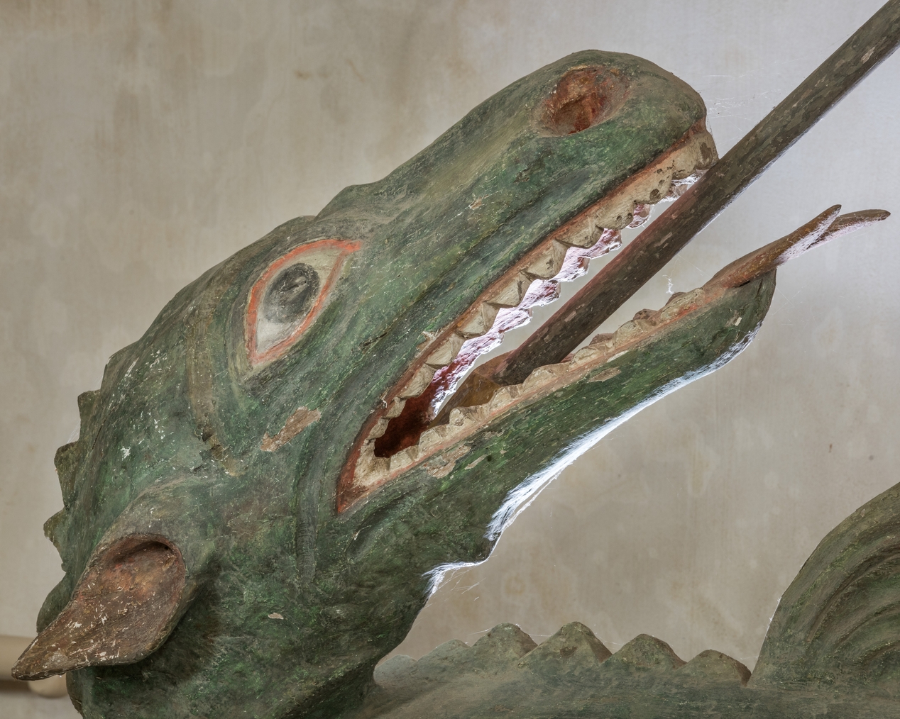 Vue de détail : tête du dragon qui forme avec saint Georges un groupe sculpté.Immatriculation