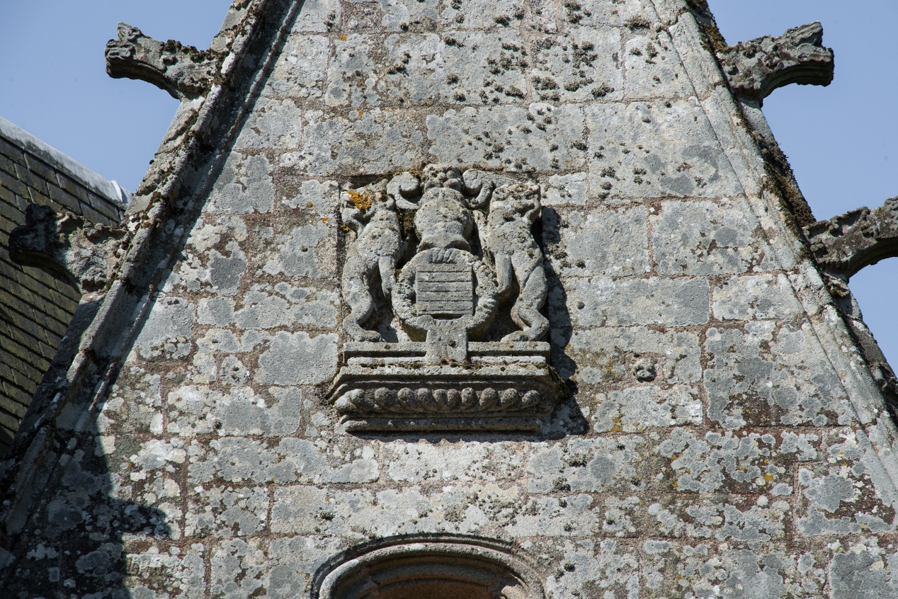 Vue de détail : armoiries sur un des pignons du chevet.Immatriculation