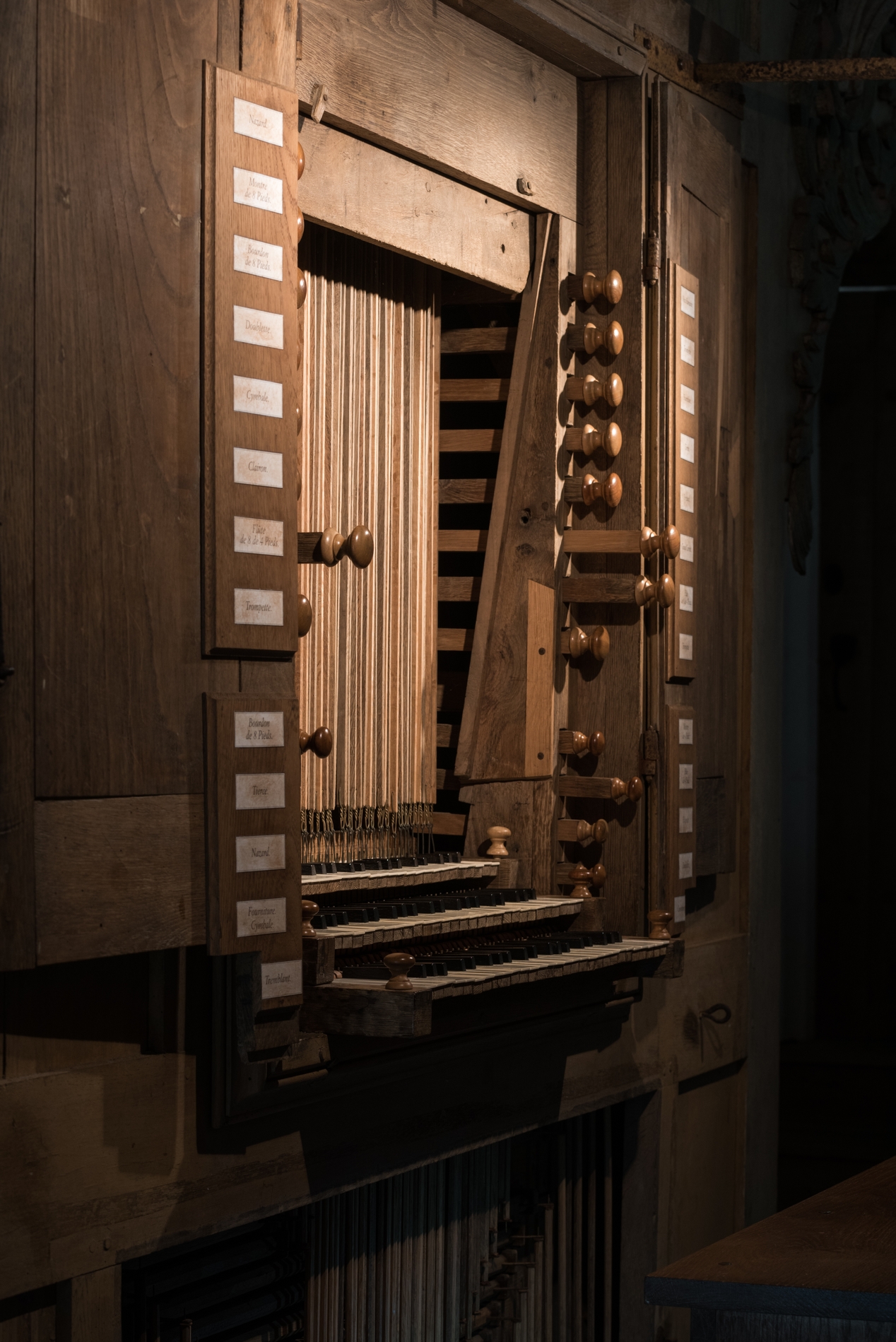Vue de détail : départ de la mécanique suspendue du grand orgue.Immatriculation