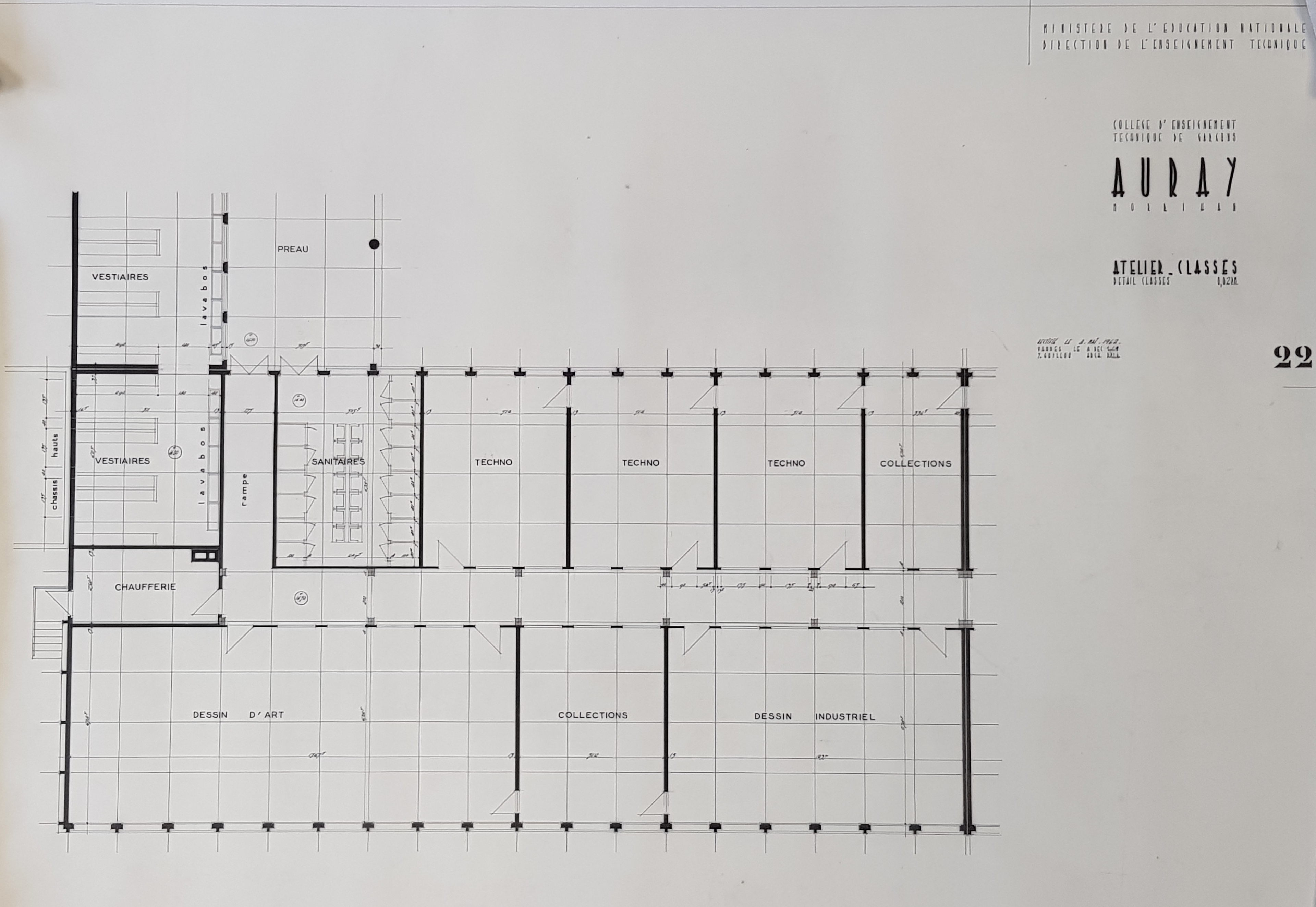 Plan de l'atelier et des classes : détail (Yves Guillou architecte, 1961, rectifié 1962). Noter entre autres la salle dédiée aux collections.Immatriculation