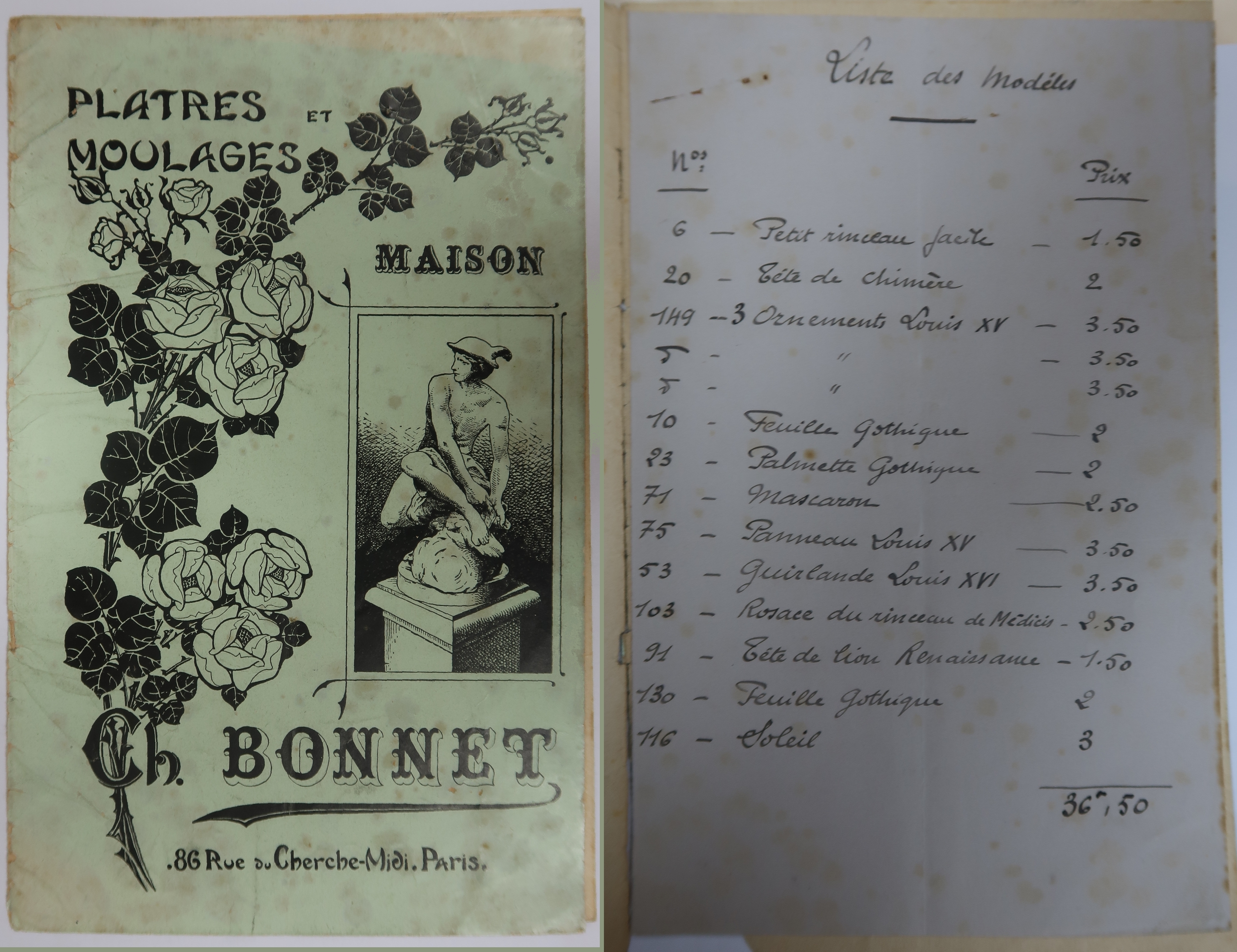 "Moulages et plâtres. Maison Ch Bonnet". "Liste des modèle". Probablement 1925.Immatriculation