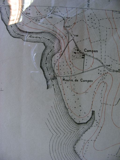 Moulin à marée de Campen, Plan de la commune par Gay, Ministère de la Reconstruction, 1952 : partie sud-est de la ville. AD Morbihan, 1FI 381/4.Immatriculation