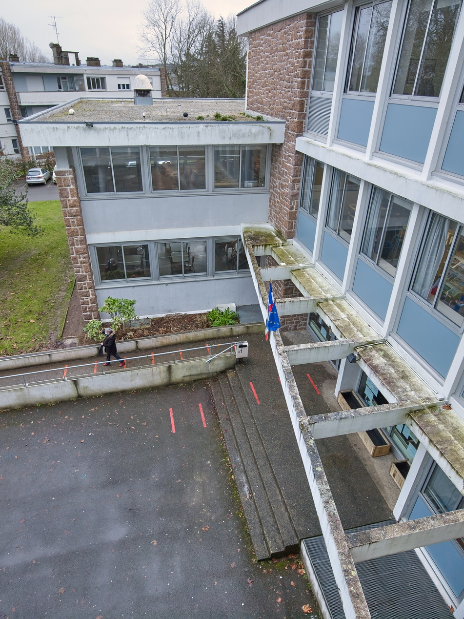 Vue prise au dessus de l'entrée. Auvent ajouré, façade nord-ouest du réfectoire.Immatriculation