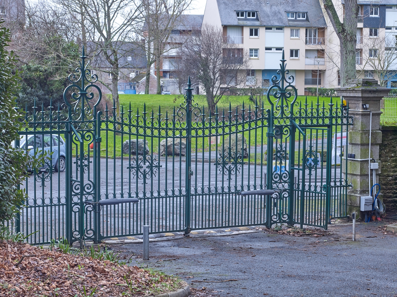 Portail d'accès au lycée (entrée sud-est), datant probablement de l'époque (19e siècle) de la construction du "château" de Poulgoïc.Immatriculation