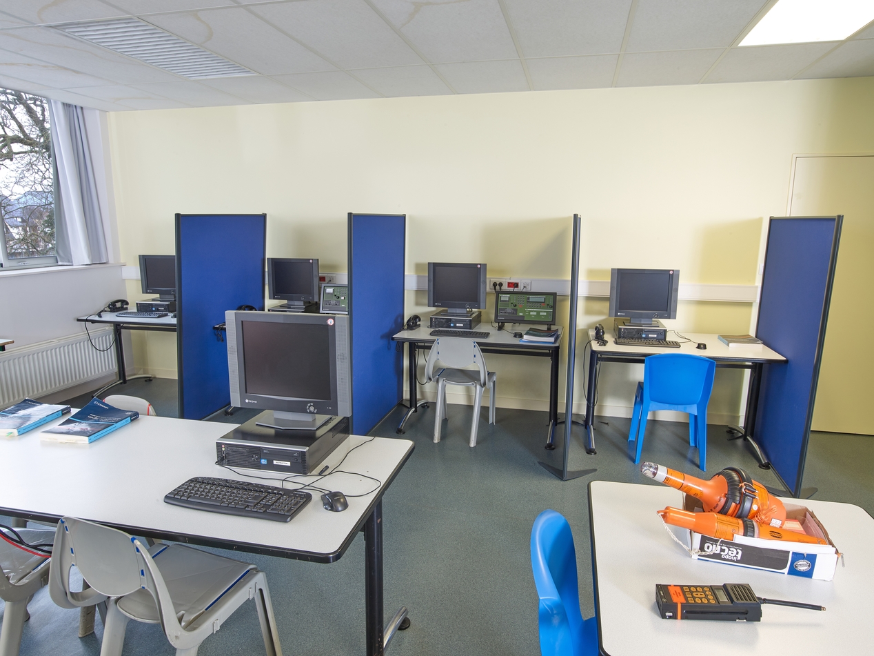 Atelier radio. Vue d'ensemble : bureau du professeur et quatre boxes.Immatriculation