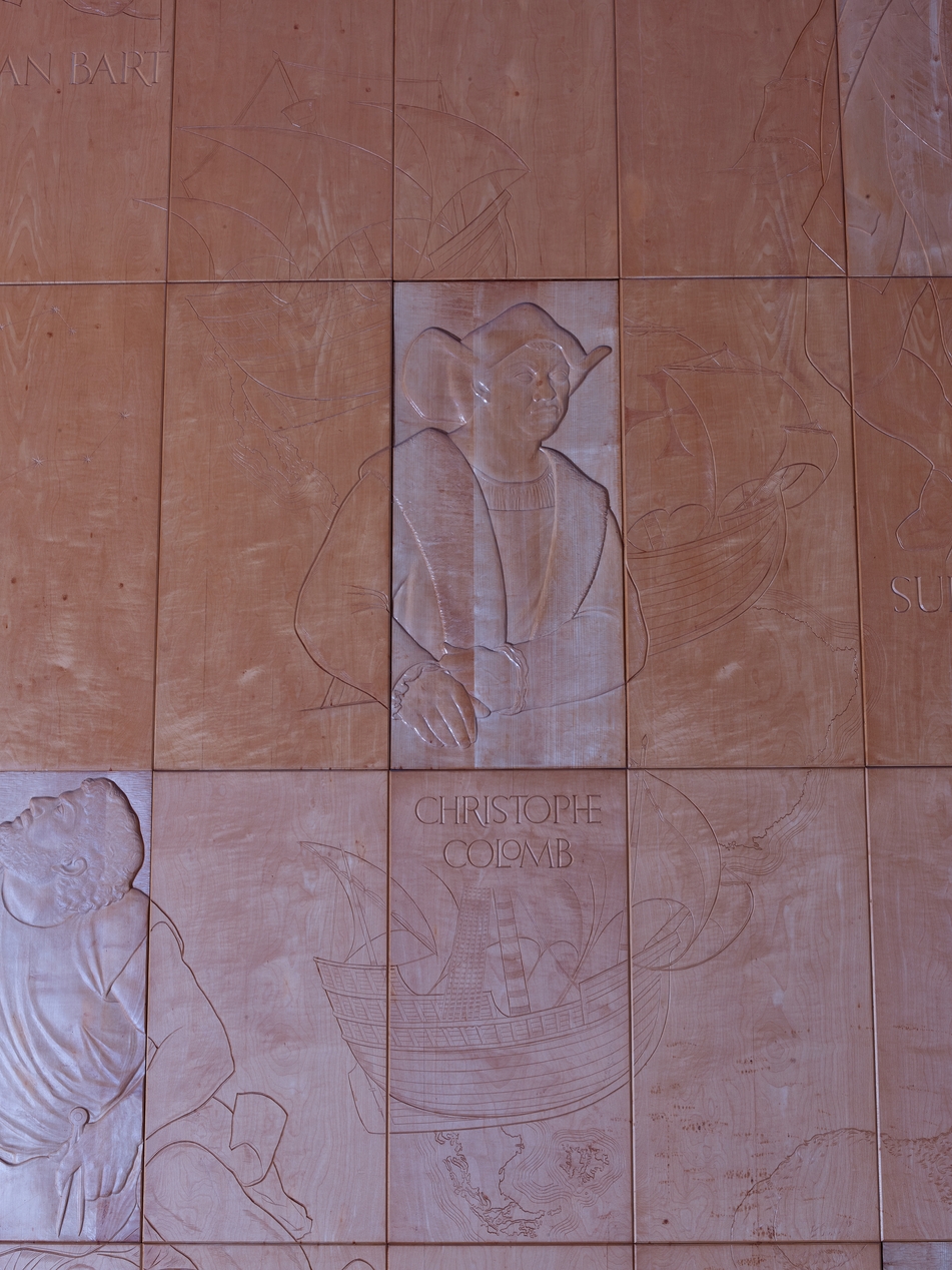 Ensemble sculpté de Séraphin Gilly (1963), "Les grands marins de tous les temps". Vue de détail : Christophe Colomb. Le panneau central est sculpté plus profondément, jusqu'au cœur en sycomore, tandis que les panneaux périphériques sont simplement gravés dans l'épaisseur de l'acajou.Immatriculation