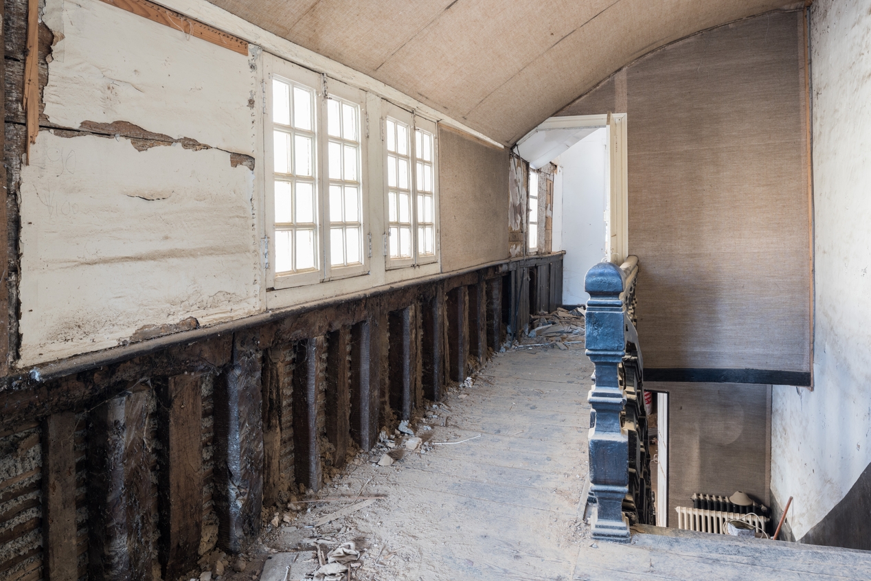 Escalier et coursive du deuxième étage (restauration en 2021).Immatriculation