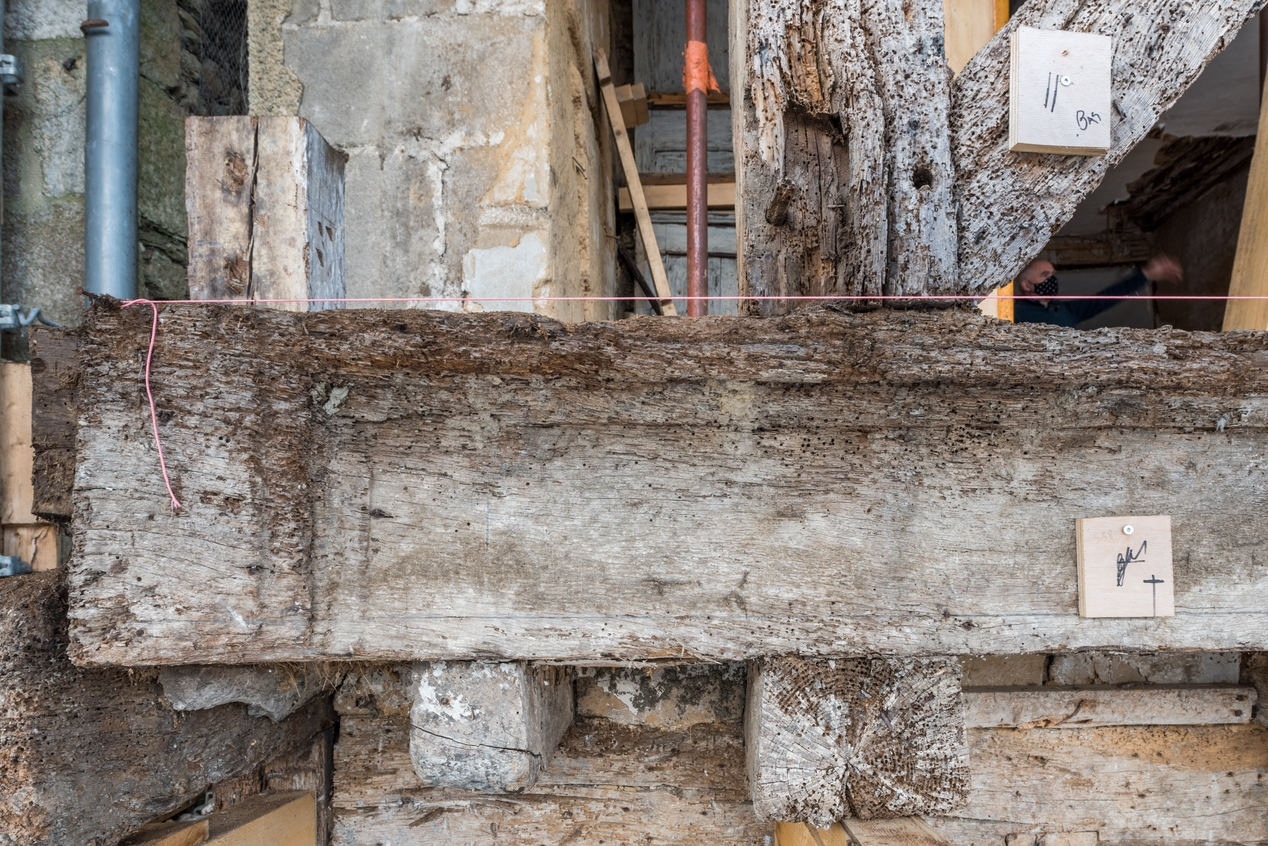 Détail des moulures de la sablière basse du deuxième étage (restauration en 2021).Immatriculation