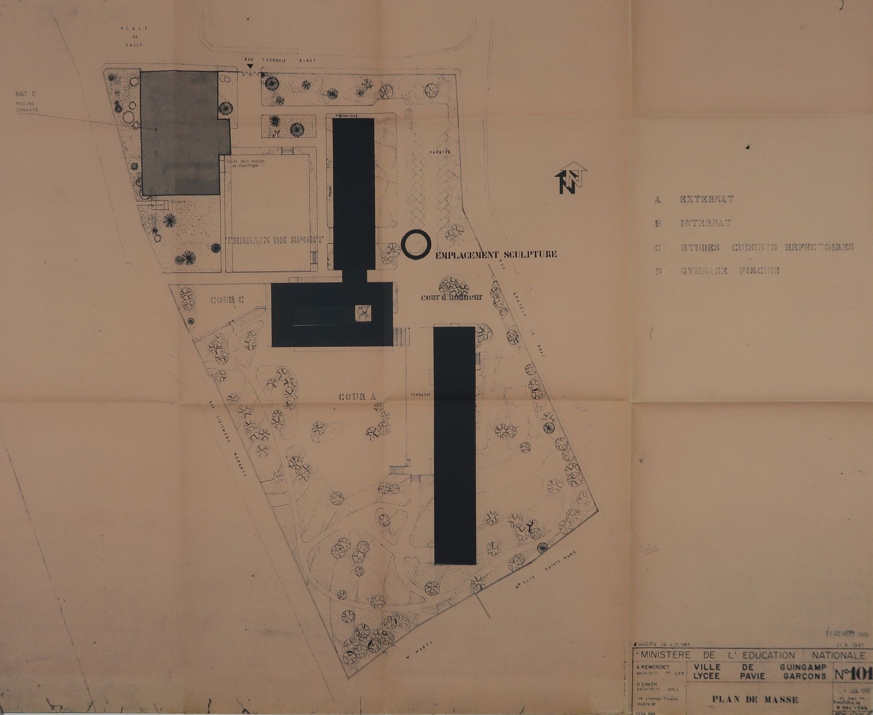 Plan de masse avec emplacement de la sculpture de Georges Delahaie (1972). André Remondet et Patrice Simon, architectes, 1968.Immatriculation
