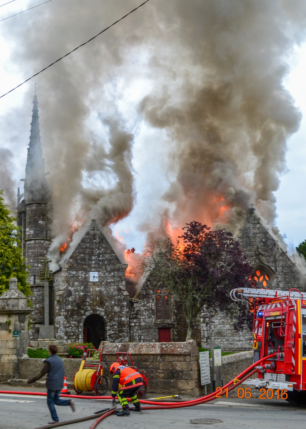 L'église en feu lors de l'incendie du 21 juin 2016, façade sudImmatriculation