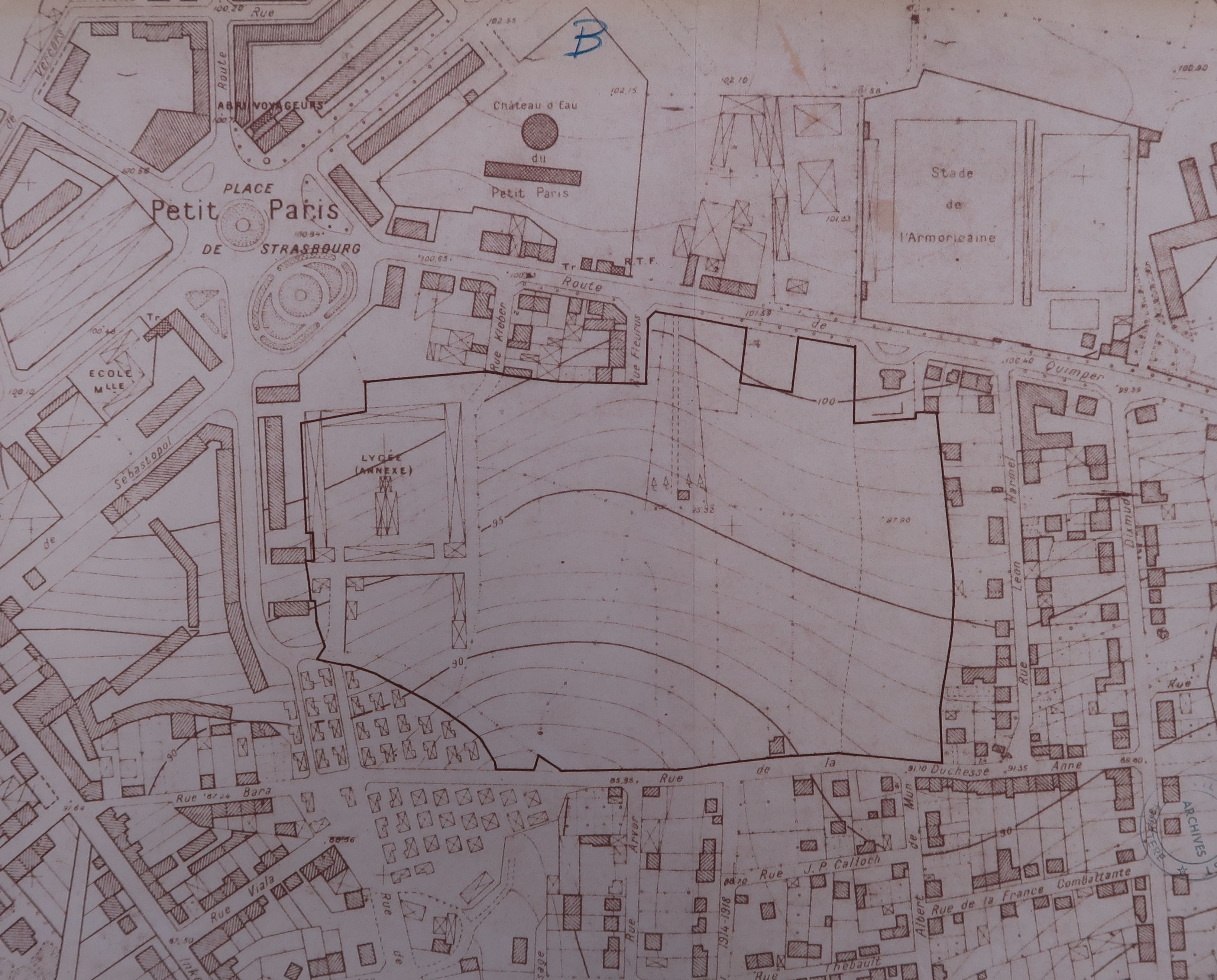Plan de situation avec courbes de niveau. Sans nom ni date. Le rapprochement des courbes de niveau donne une indication de la forte déclivité du terrain. Le plan du collège moderne en baraques est présent.Immatriculation