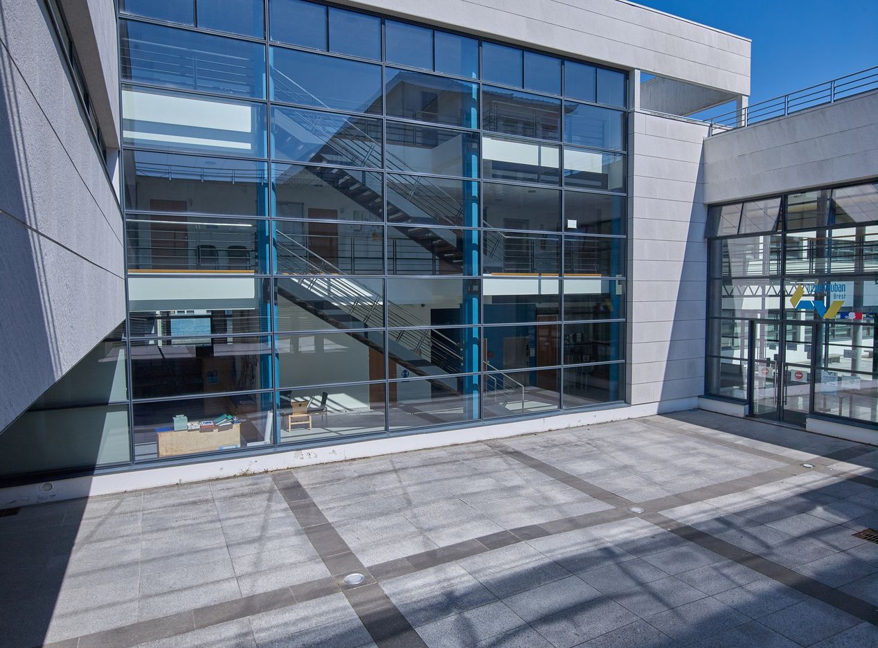 Verrière du bâtiment de l'accueil et de l'administration (bâtiment W) : transparence sur les escaliers et sur l'entrée. vue prise du sud-ouest. Archipole Urbanisme et Architecture, 2005.Immatriculation