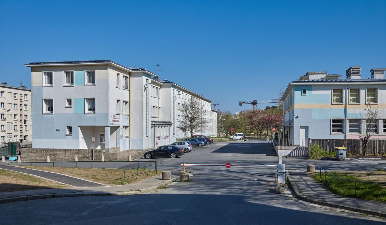 Vue d'ensemble partielle prise du sud vers le nord, dans l'un des axes secondaires de la composition. A gauche, l'entrée ouest de la cité scolaire et l'infirmerie. A droite, les cuisines. J-B. Mathon, architecte.Immatriculation