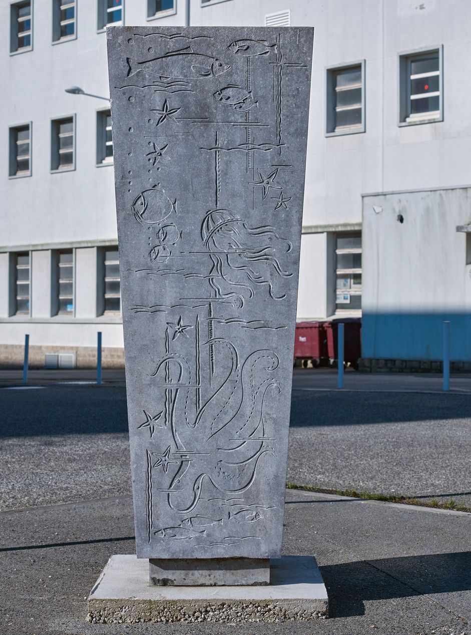 Marcel Renard (1893-1974), Obélisque sculpté sur les quatre faces (vers 1961). Sur cette face, évocation de la faune sous-marine : pieuvre, méduse, étoile de mer, lieu, daurade...Immatriculation