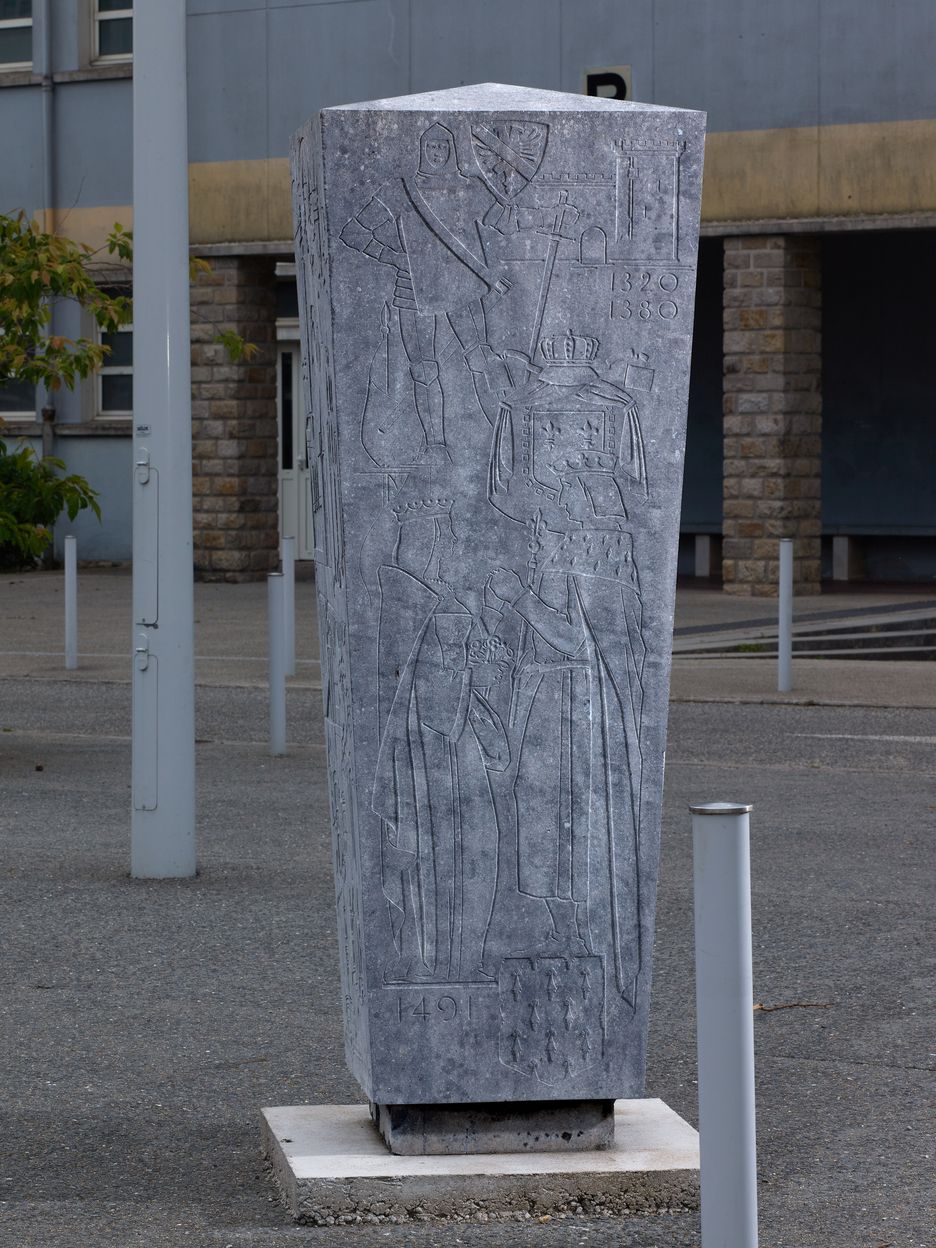 Marcel Renard (1893-1974), Obélisque sculpté sur les quatre faces (vers 1961). Sur cette face, évocation de Bertrand Du Guesclin (1320-1380) et du mariage d'Anne de Bretagne avec Charles VIII (1491).Immatriculation
