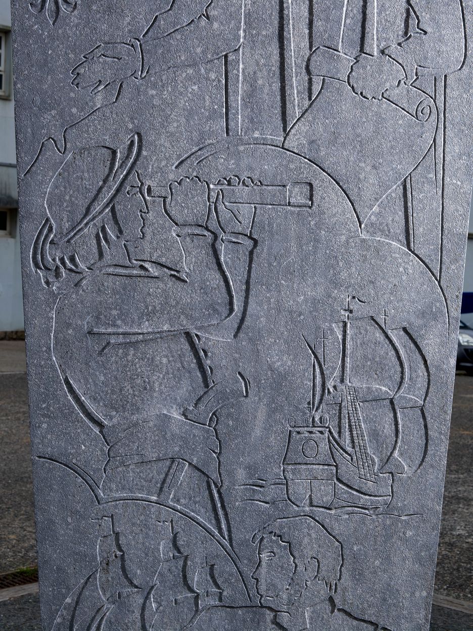 Marcel Renard (1893-1974), Obélisque sculpté sur les quatre faces (vers 1961). Détail : un corsaire.Immatriculation