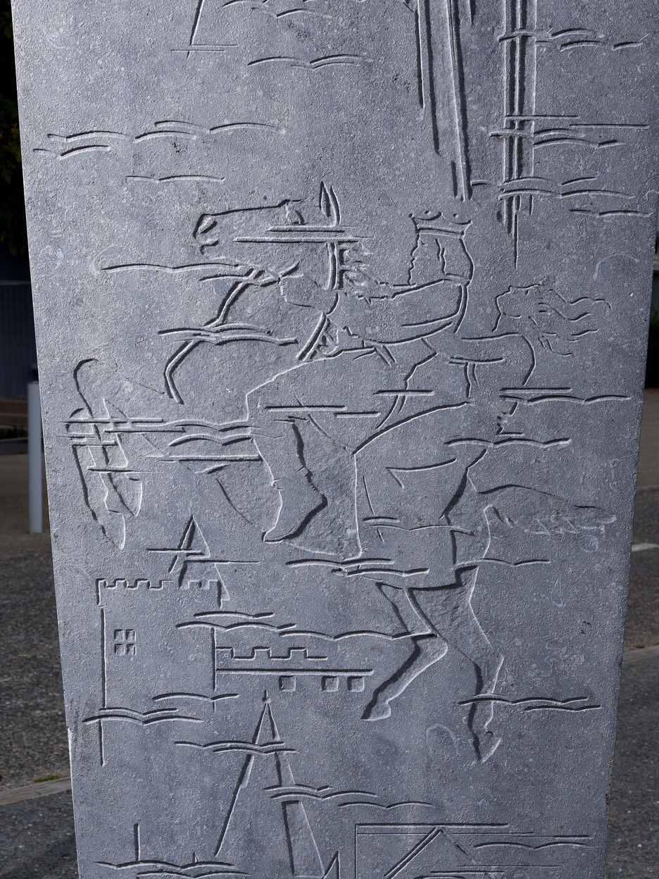 Marcel Renard (1893-1974), Obélisque sculpté sur les quatre faces (vers 1961). Détail sur une légende bretonne : Gradlon fuit la mer lors de l'engloutissement de la cité d'YS, sa fille Dahud a du mal à se maintenir sur le cheval, avant sa chute.Immatriculation