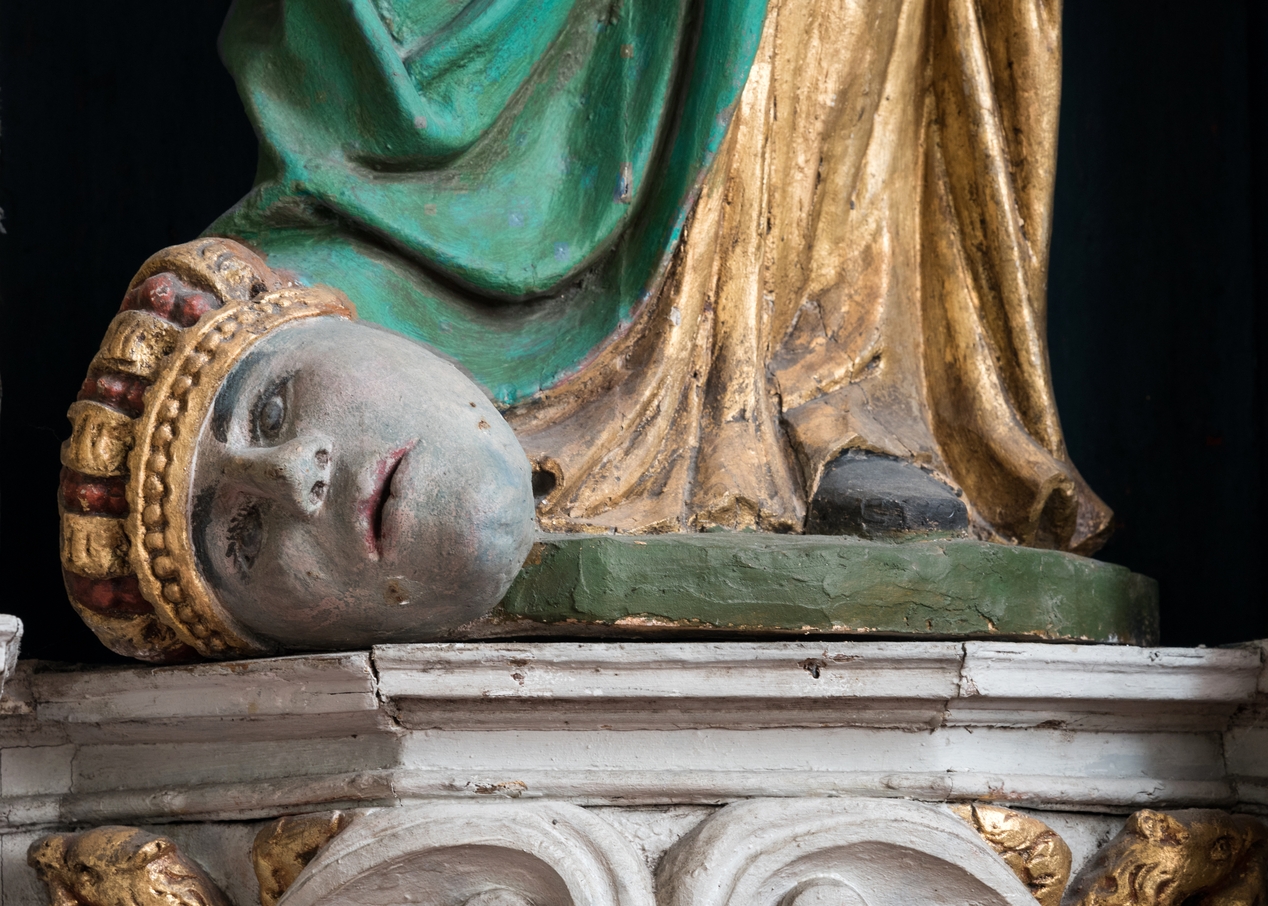 Vue de détail de la tête couronnée aux pieds de sainte Catherine d'AlexandrieImmatriculation