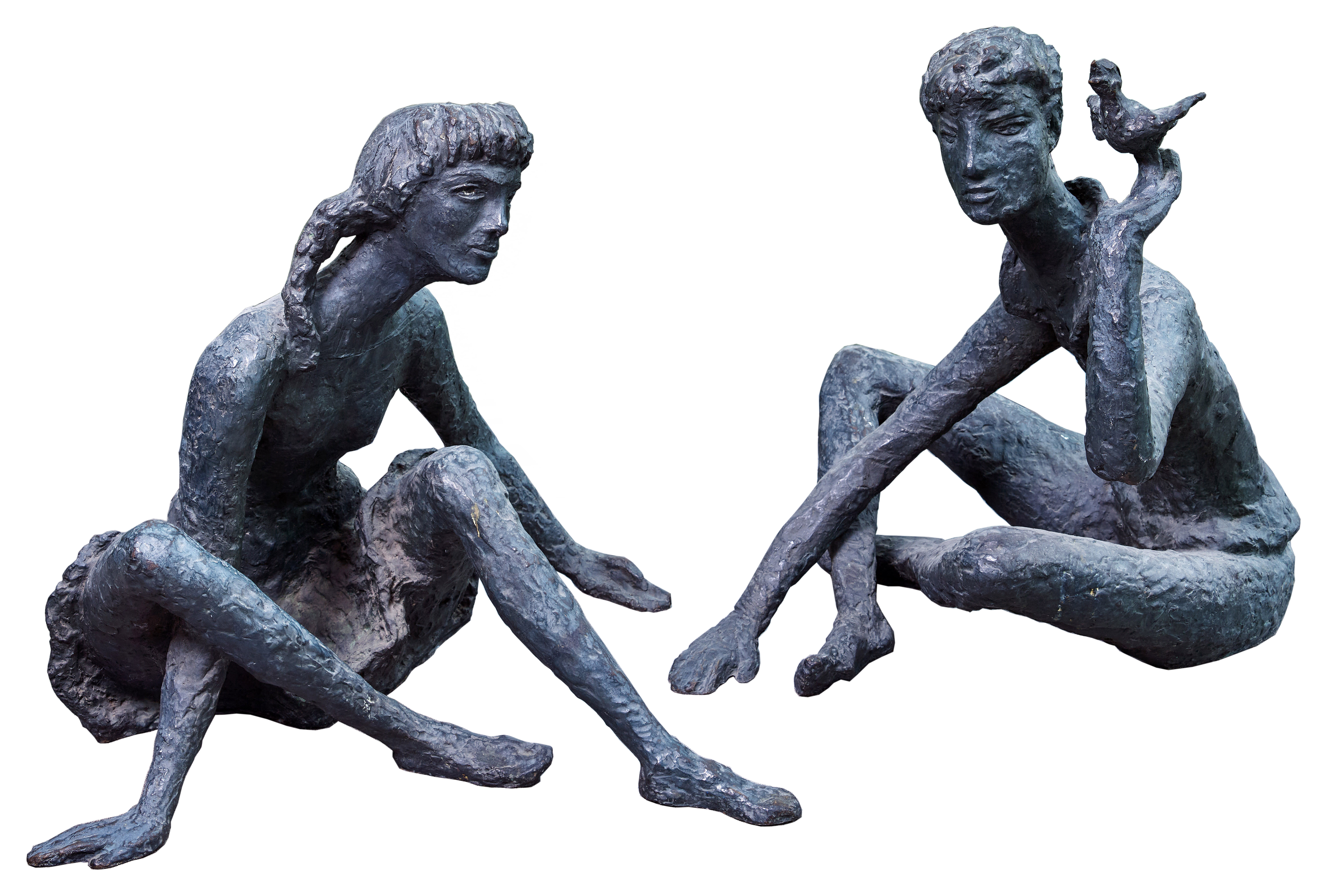 Photographie détourée. Deux sculptures en bronze, en ronde bosse, représentant "deux jeunes gens" (vers 1961). Noor Zade Brener, sculptrice, (née en 1922).Immatriculation