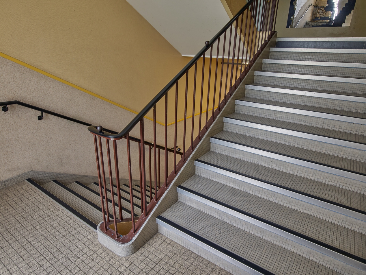 Cage d'escalier de l'externat du lycée. Jean Lacaille, architecte, vers 1966-1967. Noter la présence de dispositifs anti-glissades sur les rampes, que l'on trouve également à la cité scolaire Kerichen.Immatriculation
