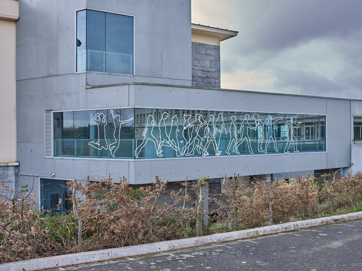 Galerie de liaison entre le lycée et le collège. Façade nord. Ouvrage rendu nécessaire pour la mise en accessibilité. Noter l'encorbellement et le traitement du grand bandeau vitré en angle, support d'une fresque.Immatriculation
