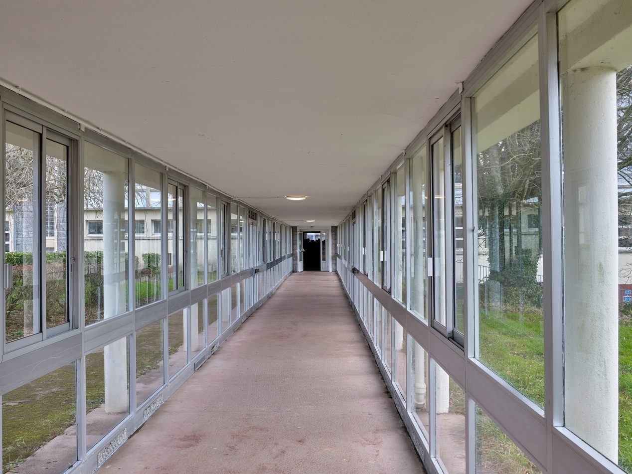 Galerie de liaison entre service de restauration et collège, prise de l'ouest vers l'est. Jean Lacaille, architecte, vers 1966. Galerie vitrée ultérieurement.Immatriculation
