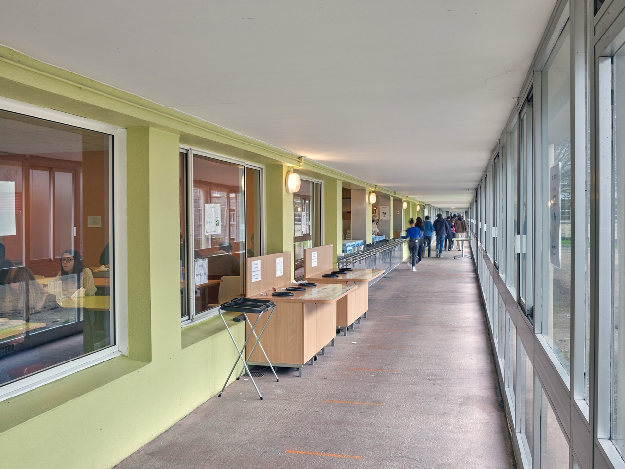 Galerie de circulation le long des réfectoires, transformée pour abriter la desserte des plateaux.Immatriculation