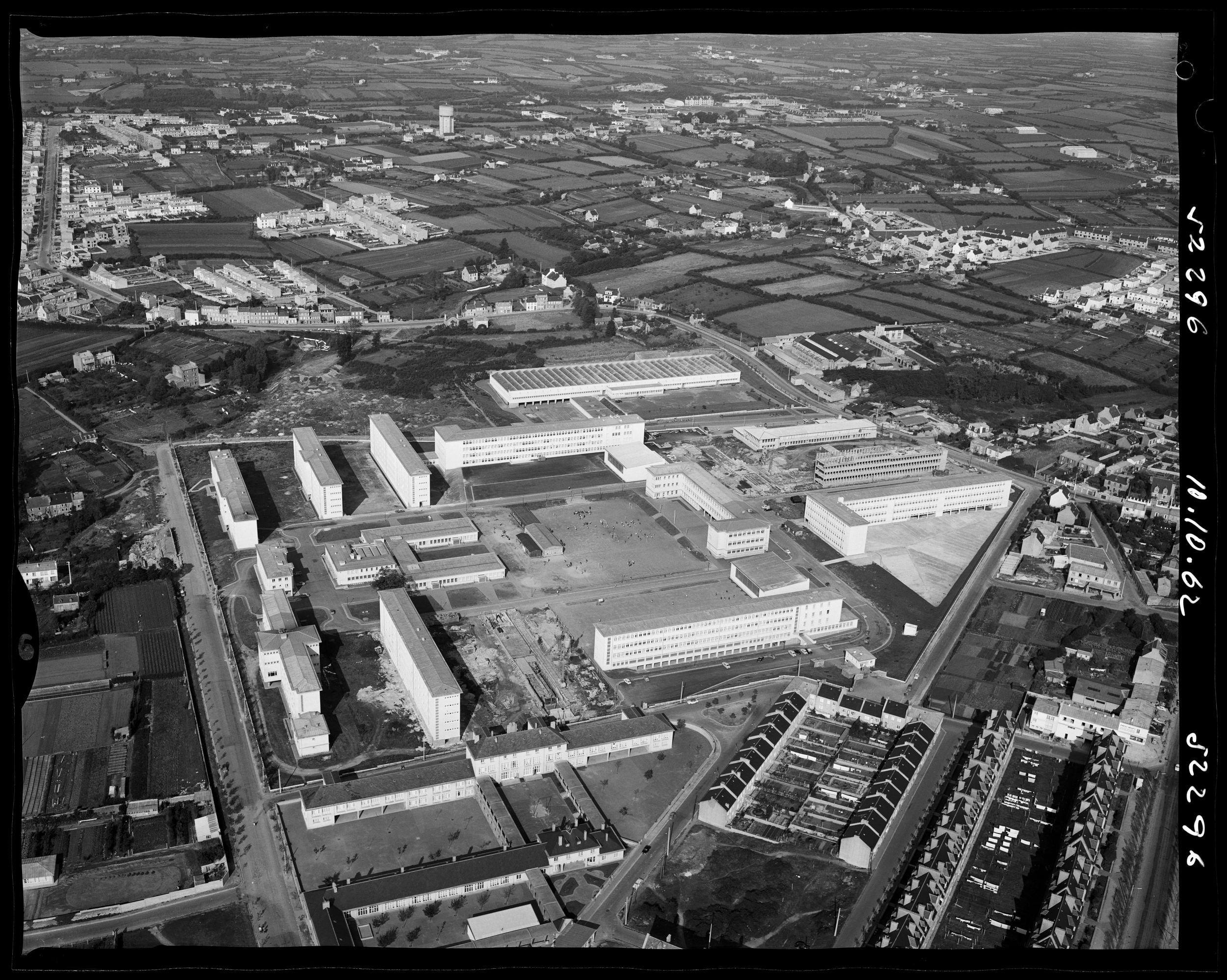 Vue aérienne de la cité scolaire quasi achevée, le 10/10/1962. Une des barres d'externat du collège technique féminin, actuel lycée Lesven, et au premier plan, une barre d'internat, sont en cours de construction. Jean-Baptiste Mathon, architecte.Immatriculation