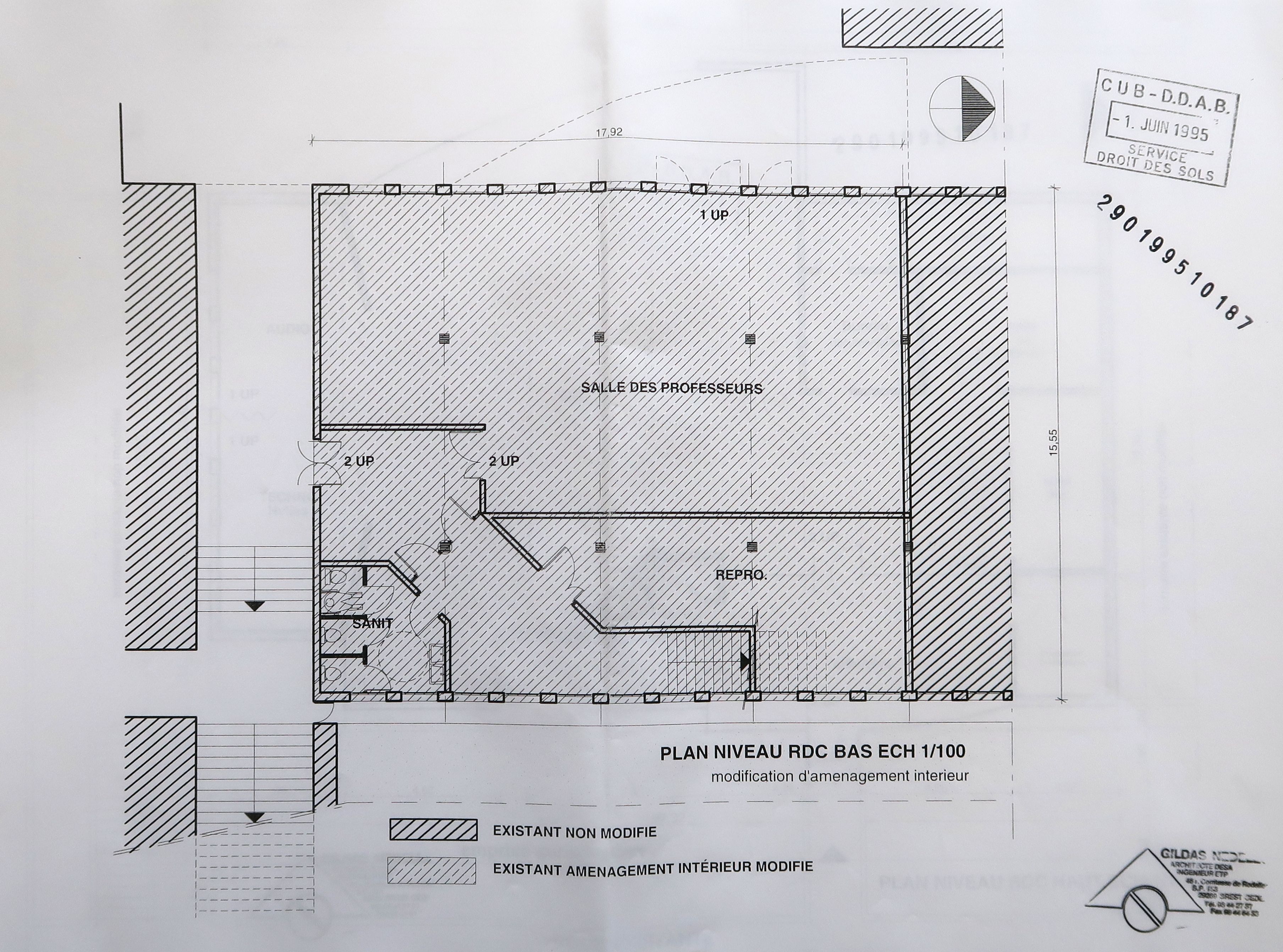 Centre de documentation et d'information : plan du rez-de-chaussée bas. Gildas Nédélec, architecte, 1er juin 1995.Immatriculation