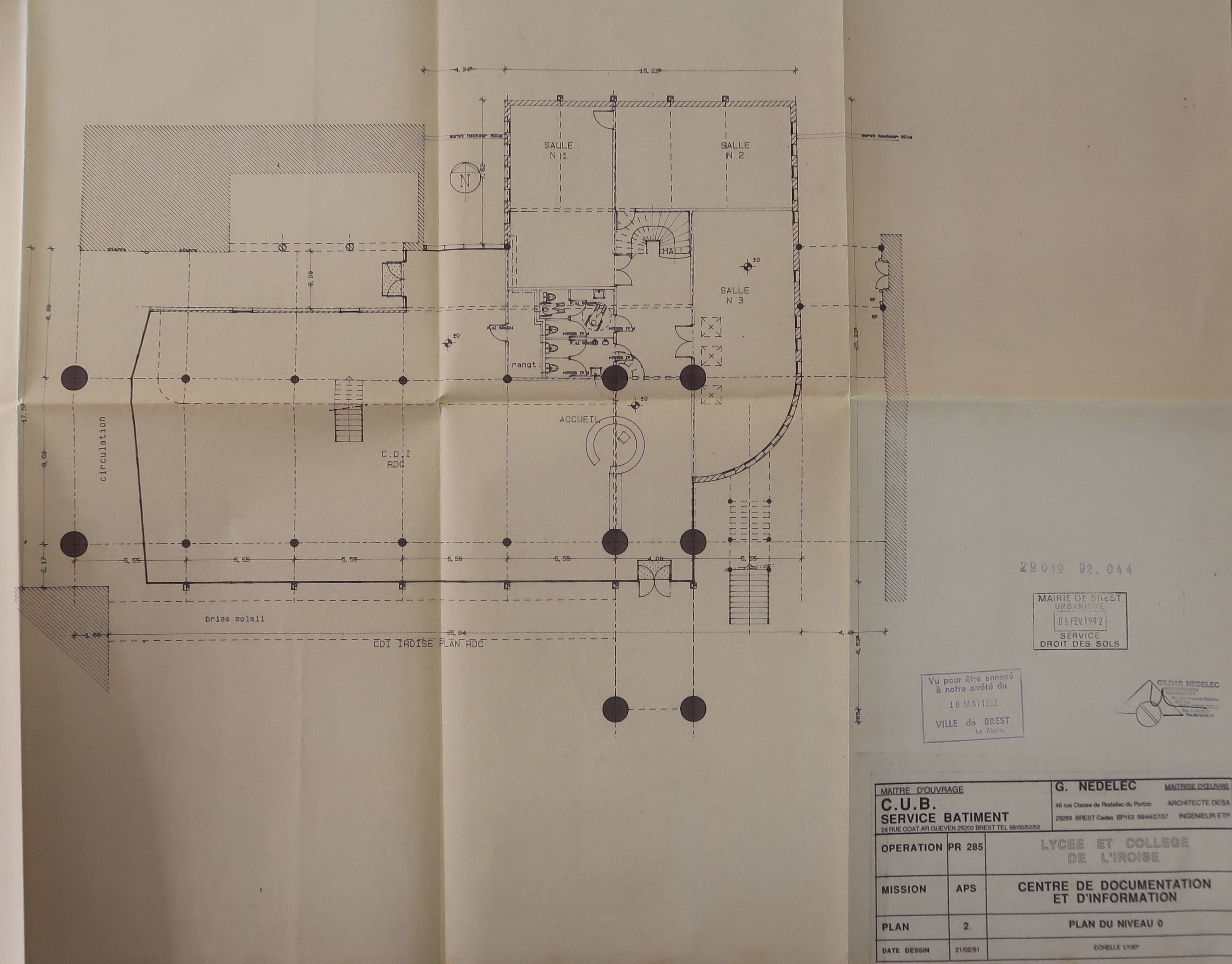 Centre de documentation et d'information, plan du niveau zéro. Gildas Nédélec, architecte, 1992.Immatriculation