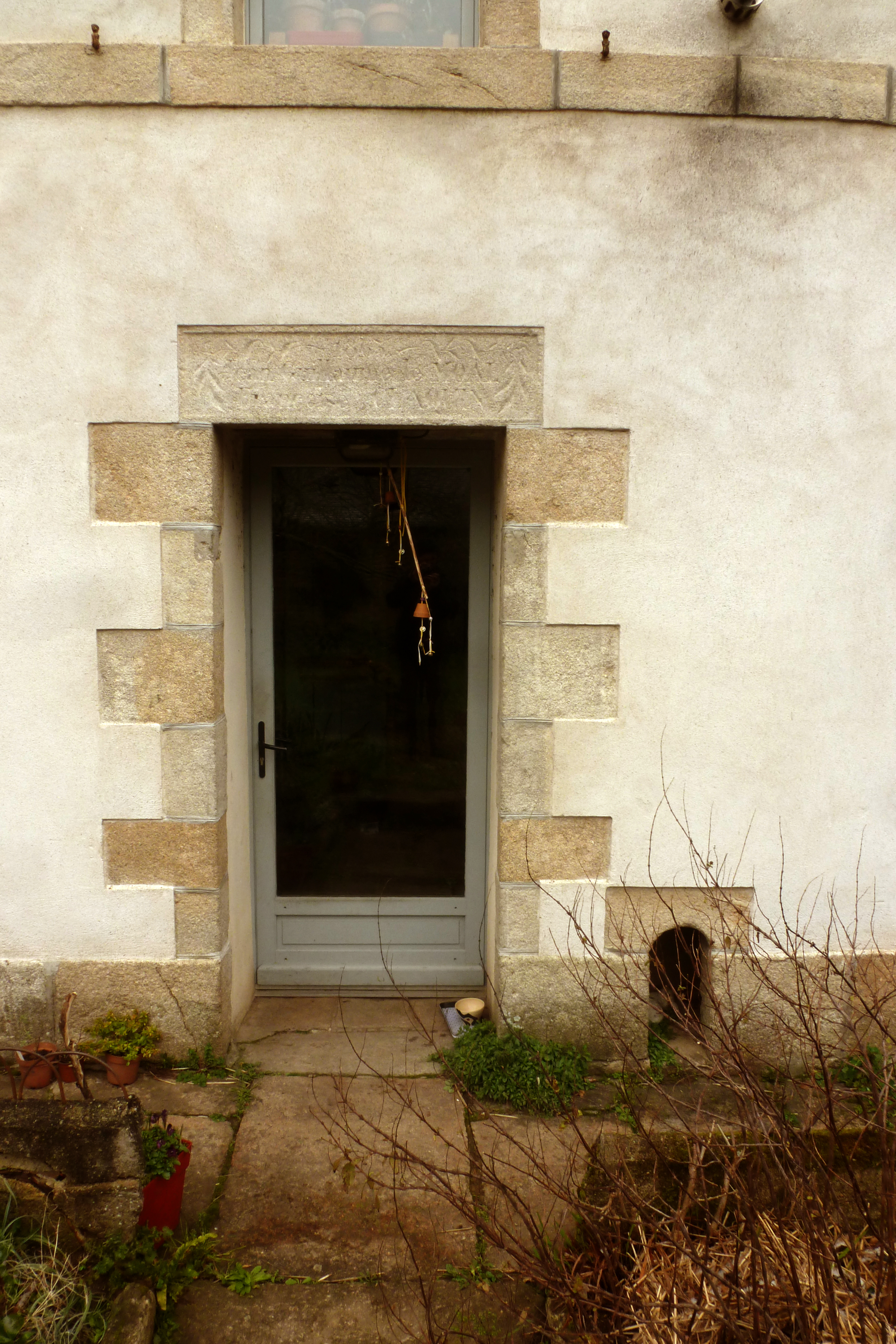 Logis daté 1865, détail de la porte d'entrée et niche à chien. Inscription sur le linteau : 1865 / Jean Guillaume Le MOAL / Françoise CLAQUIN.Immatriculation