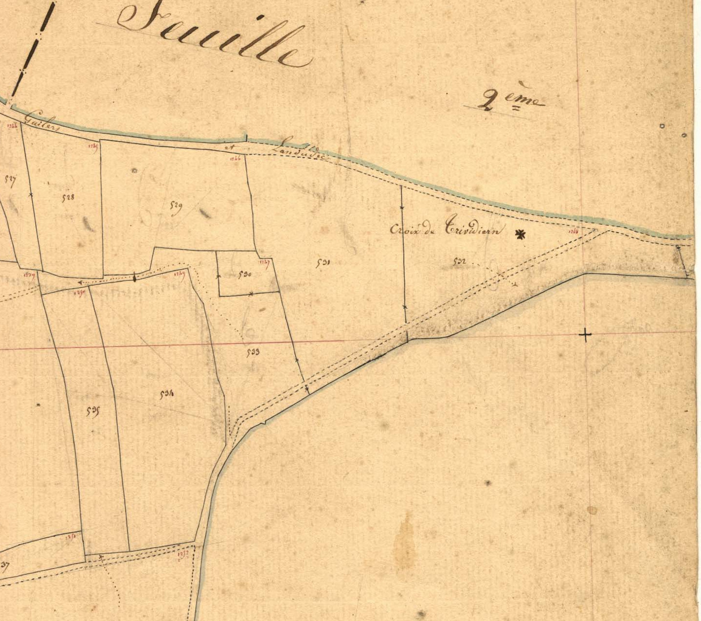Emplacement signalé de la croix de Trividiern. Section D 2 de Kervitam du cadastre ancien de la commune de Mahalon, 1836.Immatriculation